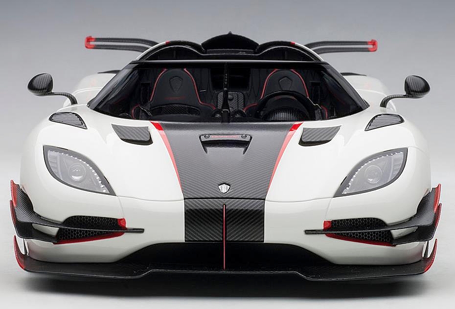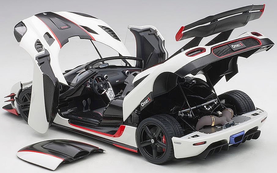 ケーニグセグ社の創業20周年を記念して作られ、2014年のジュネーブモーターショーで発表された『ケーニグセグ One:1』は、「アゲーラ」をベースに開発された究極のエボリューションモデルです。軽量なカーボンファイバーシャシーのミッドシップに搭載される自社開発した最高出力1360PSの5リッターV型8気筒ツインターボエンジンは、環境に配慮したE85バイオ燃料、レース燃料、ガソリンのどれでも走行が可能。そして、0-100km/h加速2.6秒、0-400km/hまでがおよそ20秒、最高速度440km/hの驚愕のパフォーマンスを発揮します。『One:1』という名前は、最高出力1360PSに対し車重が1360kgの「パワーウェイトレシオ 1:1」に由来。また、そのパワーがちょうど1メガワットに当たることから、ケーニグセグでは量産車世界初の「メガカー」と呼んでいます。オートアートでは、プロトタイプ1台を含むわずか7台のみが製造された希少なスウェーデンのハイパーカーをモデル化しました。空力性能を追求したエクステリアデザインやエアロパーツの数々、リアの2本のシャークフィンやモデルでも可動が楽しめるアクティブ・リアウィングなどもリアルに再現。フロント19インチ・リア20インチのセンターロック式カーボンホイールと特別に開発されたミシュランカップタイヤ、前後カーボンセラミックブレーキといった足回りにも拘っています。そして、リアカウルを開けると広がる、まるでレーシングカーのような複雑なエンジンルームとリアサスペンション、個性的な開閉方法を採る「ラプタードア」などフル開閉モデルならではの見どころが満載です。また、実車では固定式ながら、モデルでは取り外し可能なルーフを採用。軽量レーシングシートを配置しカーボンで覆われたインテリアも観賞しやすくなっています。全3色。▼『オートアート・コンポジットダイキャストモデル』は、ボディには独自配合した「ABS」を、インナーボディには「ダイキャスト」を採用。それぞれの素材の利点を最大限に生かし、ダイキャストモデルに劣らない高剛性と重量感を実現しながら、目の覚めるようなリアルでシャープなボディラインの再現と、ダイキャストボディ以上に正確なチリ合わせやパーツ開閉を可能にした「全く新しい」革新的モデルカーです。