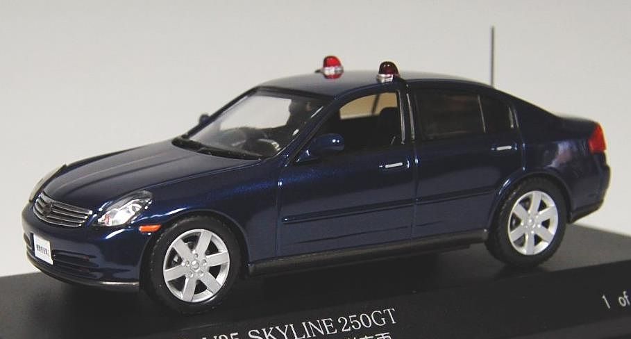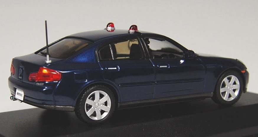 V35スカイライン機動捜査隊車両。 ER34スカイラインの後継車として全国的に配備され、その多くが250GTグレードの捜査用車両である。水滴型赤色回転灯のダブル仕様は神奈川県警察が元祖と云われ、その姿を公に初めて現したのがこのV35スカイラインである。