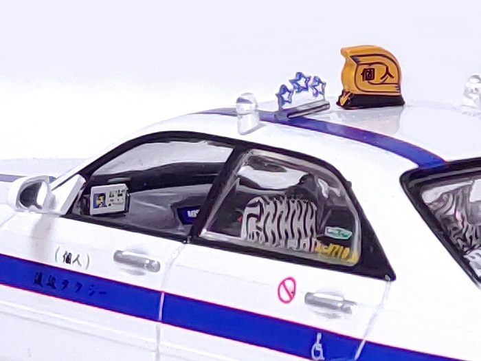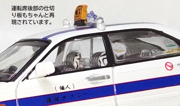 メーカー:京商 スケール:1/43 個人タクシー独特の屋根の表示灯やステッカー・運転手写真付きカード・運転席後部仕切り板・シートカバーなど何処までも精密に再現されており、見ていて飽きが来なくて楽しい~! 是非お手元にコレクションして頂きたいです。